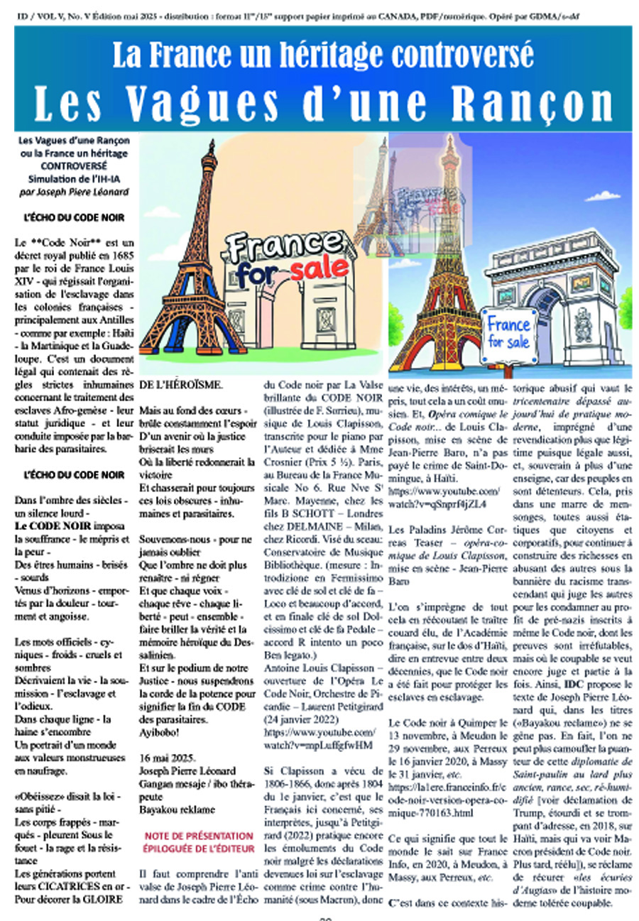 C’est dans ce contexte historique abusif qui vaut le tricentenaire dépassé aujourd’hui de pratique moderne, imprégné d’une revendication plus que légitime puisque légale aussi, et, souverain à plus d’une enseigne, car des peuples en sont détenteurs. Cela, pris dans une marre de mensonges, toutes aussi étatiques que citoyens et corporatifs, pour continuer à construire des richesses en abusant des autres sous la bannière du racisme transcendant qui juge les autres pour les condamner au profit de pré-nazis inscrits à même le Code noir, dont les preuves sont irréfutables, mais où le coupable se veut encore juge et partie à la fois. Ainsi, IDC propose le texte de Joseph Pierre Léonard qui, dans les titres («Bayakou reclame») ne se gêne pas. En fait, l’on ne peut plus camoufler la puanteur de cette diplomatie de Saint-paulin au lard plus ancien, rance, sec, ré-humidifié [voir déclamation de Trump, étourdi et se trompant d’adresse, en 2018, sur Haïti, mais qui va voir Macron président de Code noir. Plus tard, réélu]), se réclame de récurer « les écuries d’Augias » de l’histoire moderne tolérée coupable.