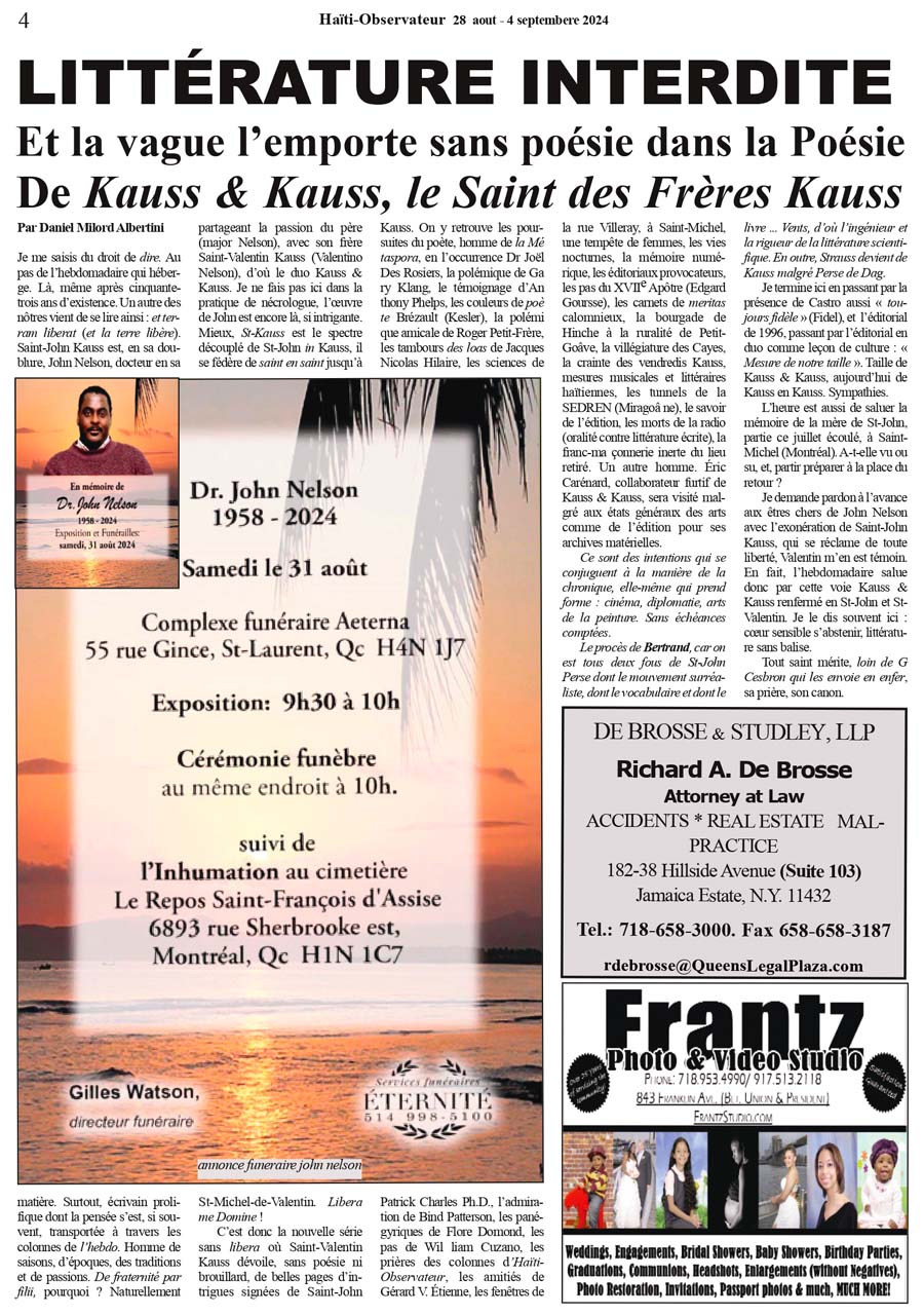 Cet article est publié par l’hebdomadaire Haïti-Observateur VOL. LIIII, No. 22 New York et se retrouve en P4 du h-o 28 aout 2024
